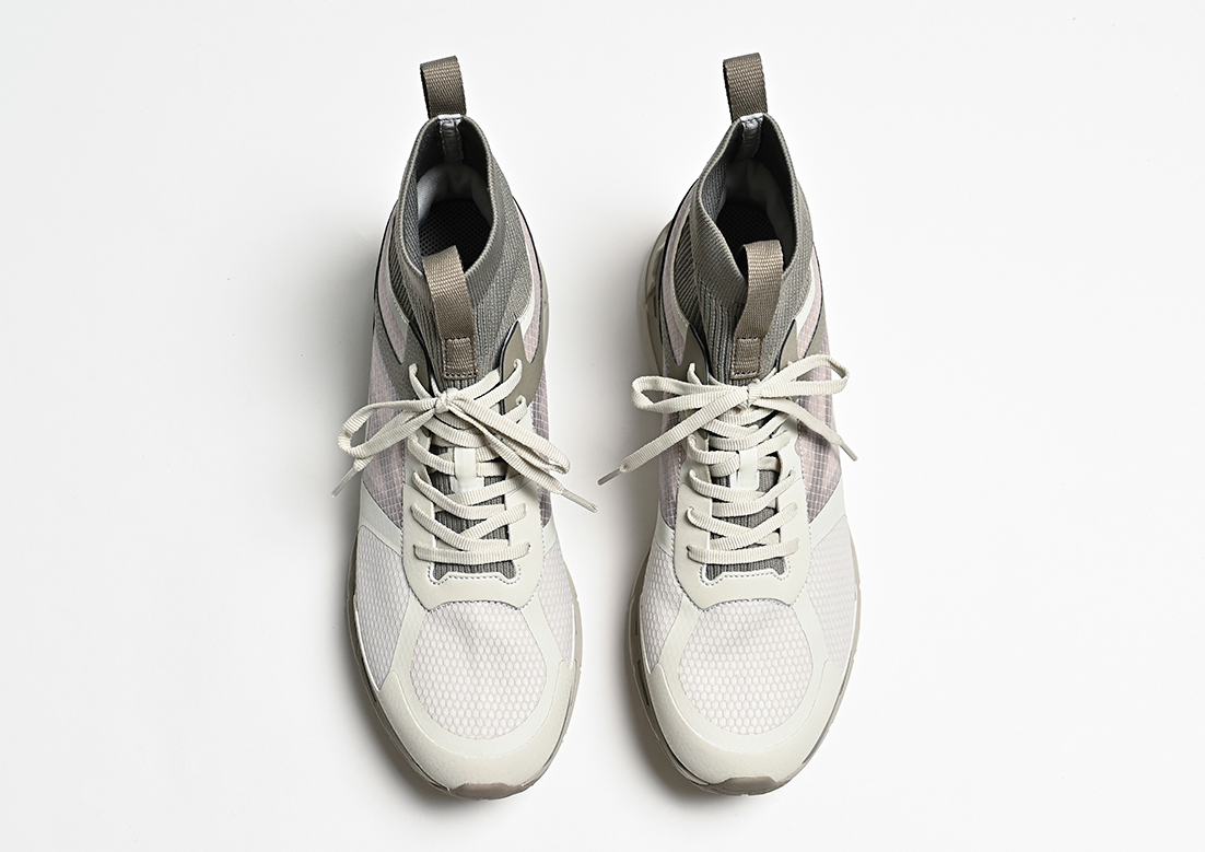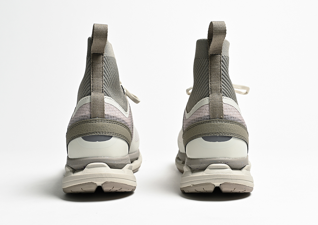 - MOISTHROUGH360 の防水性を最大限高めたモデル。通気性は従来通りのまま、ローカットでは防ぐことができなかった履き口周りからの浸水を、ハイカットのニット仕様にする事で防止。通常、防水のシューズは防水フィルムが使われる為、通気性及び伸縮性はほぼないが、MOISTHROUGH360 は防水フィルムを用いない構造の為、ニットの特徴である伸縮性と通気性を確保したまま水の浸入を防ぐことが可能となっている。